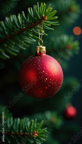 Fototapeta premium Shiny red orb suspended in mid-air on a lush evergreen tree branch, Christmas...