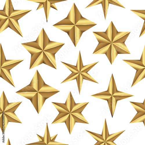 Obraz premium Shiny Seamless pattern of realistic golden 3D stars isolated on white backdrop.