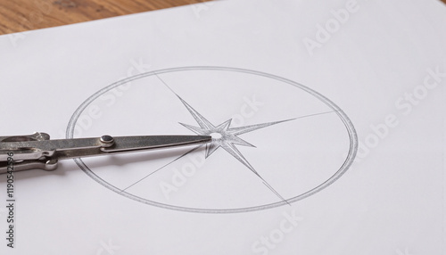 © Inna, Fototapeta premium Shiny silver compass drawing perfect circle on white paper, precision art
