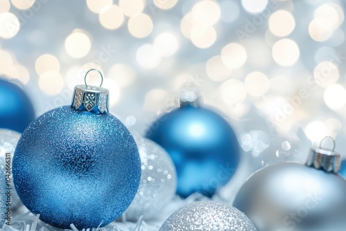 Fototapeta premium Shiny Snowflakes and Baubles on Christmas Blurred Background
