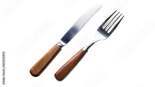 © Uncle-Ice, Fototapeta premium Shiny stainless steel knife and fork lie side-by-side on a white background