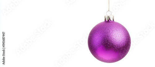 Fototapeta premium Shiny violet Christmas bauble hanging on a white background for festive holiday decoration concepts and seasonal aesthetics