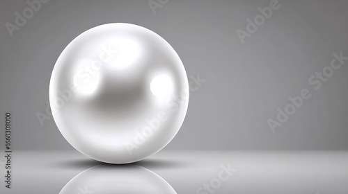 © Mary_muis/stoker ua, Obraz premium Shiny white pearl resting on a reflective surface, showcasing its smooth texture and luminous quality against a soft gray background, symbolizing elegance and beauty