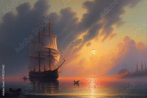 Fototapeta premium Ship at the sea in the sunset. Generative AI.