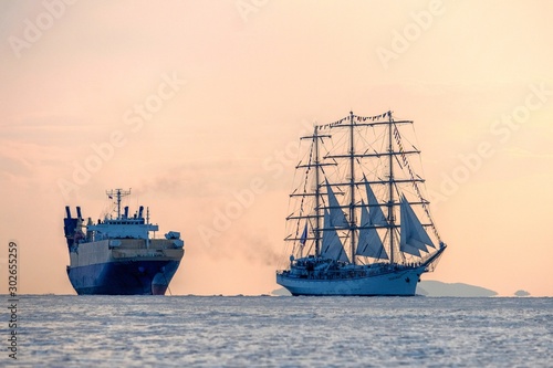 Fototapeta premium ship in the sea at sunset