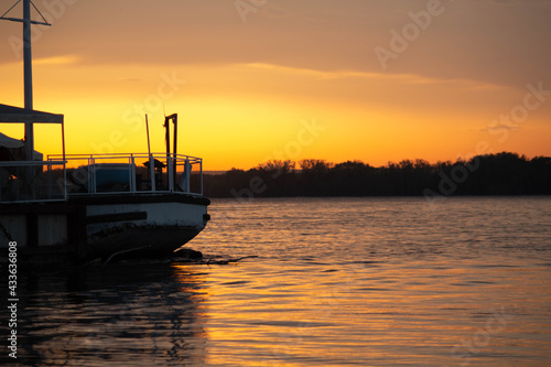 Fototapeta premium Ship on sunset, bright orange sun, big river
