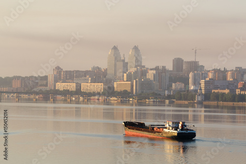Naklejka premium Ship sailing on the river in the morning at dawn I