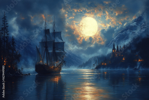 © Nigina, Obraz premium Ship sailing under full moon on lake.