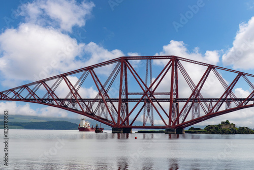 Obraz premium Ship sailing under the red Forth cantilever railway bridge across the Firth...