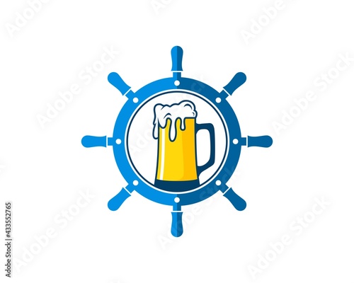 © Jefry Maviskho, Fototapeta premium Ship steering wheel with beer glass inside