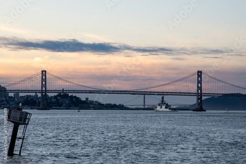 © ADW, Obraz premium ship traveling under bay bridge at sunset with Golden Gate in background