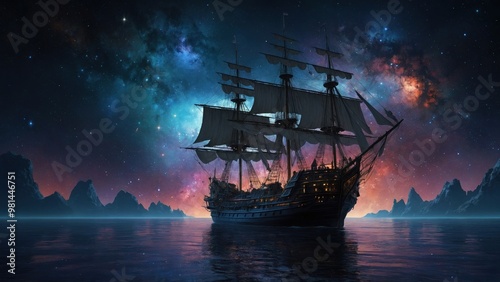 © nadunprabodana, Fototapeta premium ship with sails on the sea, starry sky, night