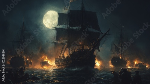 © Ali, Obraz premium Ships ablaze in a moonlit sea battle.