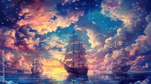 Fototapeta premium Ships at Sunset, Cloudy Sky, Epic Seascape