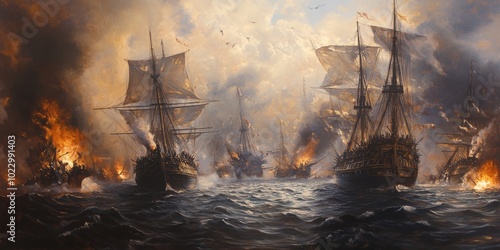© Ali, Obraz premium Ships battling in a fiery sea battle.