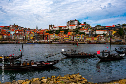 © Vitalii, Obraz premium Ships calmly floating on the water with barrels on board, in the background a view of the beautiful city of Porto