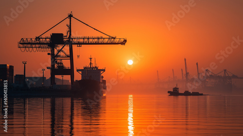 © Kateryna, Fototapeta premium Shipyard at Sunrise with Cargo and Machinery Efficiencies