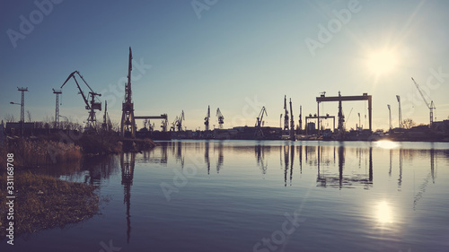 Fototapeta premium Shipyard cranes silhouettes reflected in water at sunset, color toning applied.
