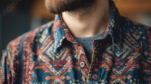 © ksu, Obraz premium Shirt with an interesting pattern close-up, model wearing a shirt