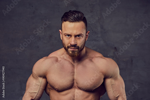 © Fxquadro, Fototapeta premium Shirtless bearded bodybuilder over grey background.