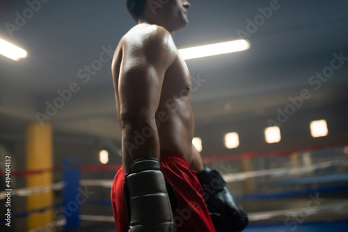 Fototapeta premium Shirtless boxer walking along ring. Cropped image of young man in red shorts and black gloves in sports hall. At training concept