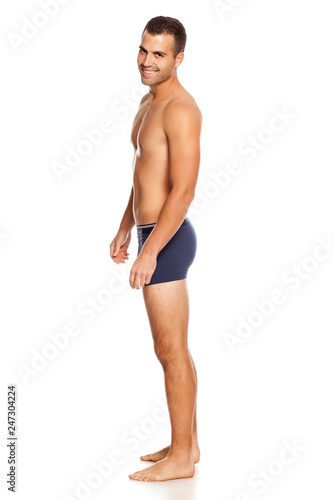 Fototapeta premium Shirtless handsome smiling man in panties on white background