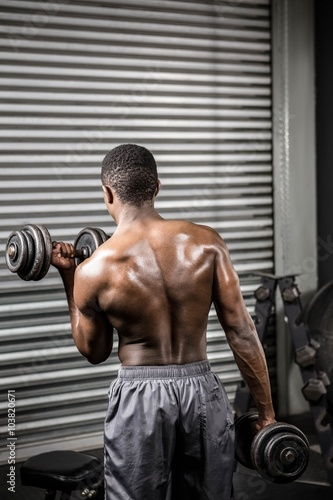 © WavebreakMediaMicro, Obraz premium Shirtless man lifting dumbbells