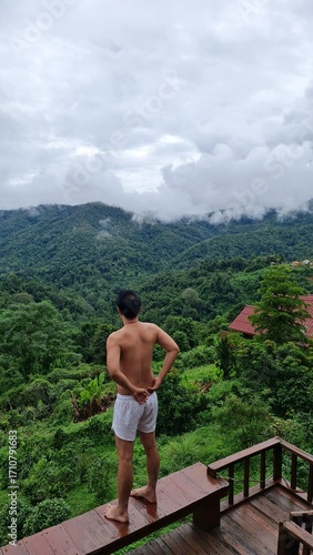 © PMBYTK, Naklejka premium Shirtless man looking at mountain view on a transparent background