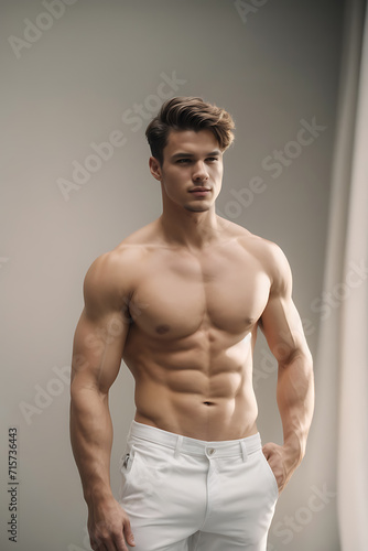 © theartofphoto, Fototapeta premium Shirtless Man Posing for Picture in Simple, Informative and Direct Way. Generative AI.