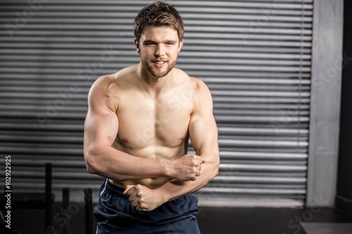 © WavebreakmediaMicro, Naklejka premium Shirtless man showing his muscle