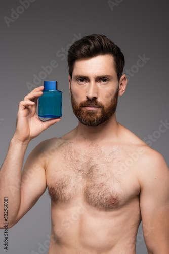 Fototapeta premium shirtless man with beard holding bottle with after shave product isolated on grey.