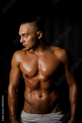 Fototapeta premium Shirtless muscular and tanned bodybuilder guy on the black background