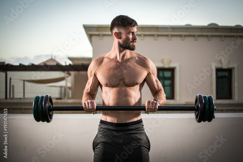 © Bojan, Fototapeta premium Shirtless muscular bearded man doing exercises with barbell outdoors.