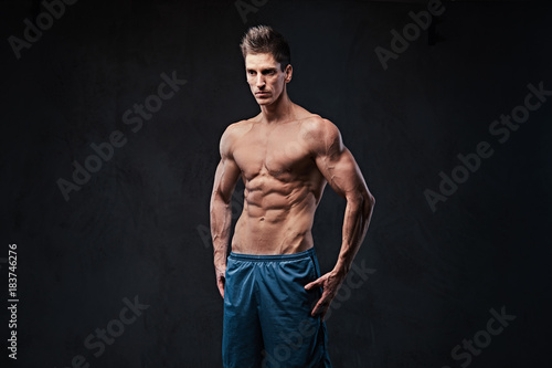 © Fxquadro, Fototapeta premium Shirtless muscular male over dark background.