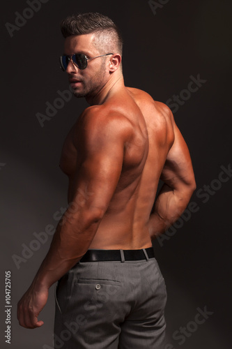 © vladimirfloyd, Fototapeta premium shirtless muscular man in pants and sunglasses posing in studio