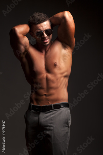 © vladimirfloyd, Fototapeta premium shirtless muscular man in pants and sunglasses posing in studio