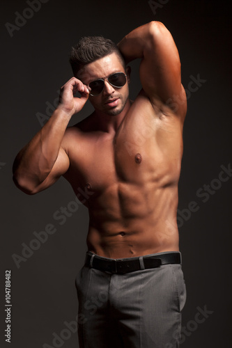 © vladimirfloyd, Fototapeta premium shirtless muscular man in pants and sunglasses posing in studio