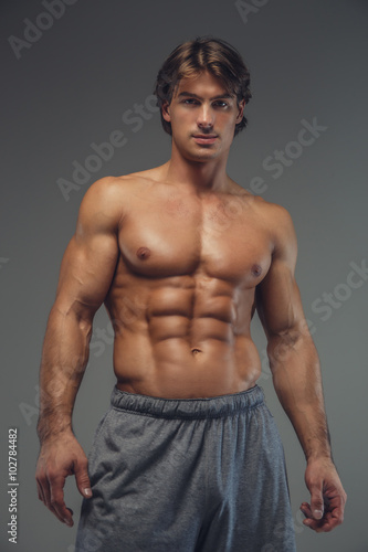 © Fxquadro, Fototapeta premium Shirtless muscular man isolated on a grey background.