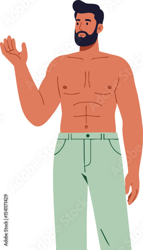 Fototapeta premium Shirtless muscular man with beard waving hand casual gesture vector illustration