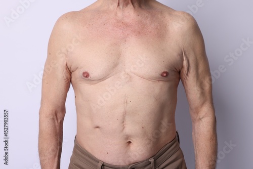 © New Africa, Fototapeta premium Shirtless senior man on light background, closeup