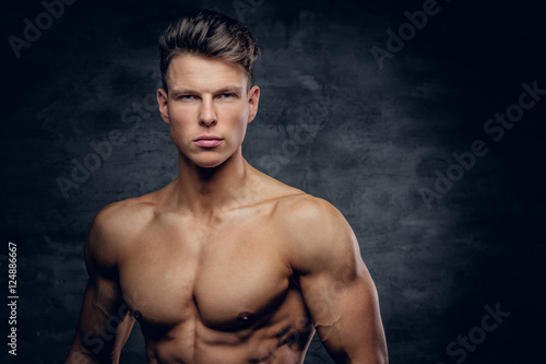 © Fxquadro, Fototapeta premium Shirtless sporty male on grey background.