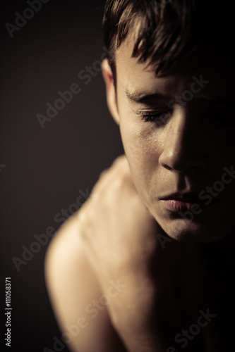 © Jan H. Andersen, Fototapeta premium Shirtless Teenage Boy with Eyes Closed in Studio