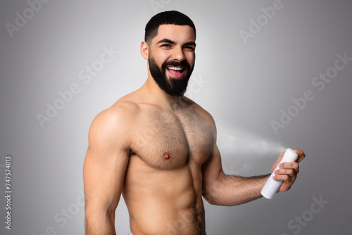 Fototapeta premium Shirtless young bearded middle eastern man using deodorant spray