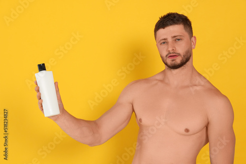 Fototapeta premium Shirtless young man holding bottle of shampoo on orange background