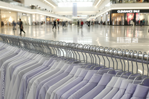 Fototapeta premium Shirts displayed for sale in a modern shopping mall during a clearance event with shoppers browsing in the background