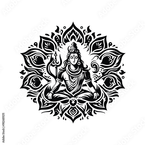 © Cici, Fototapeta premium Shiva hindu god with folk art decoration in black and white illustrations, cutout graphic