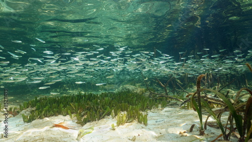 Fototapeta premium Shoal of fish on a shallow seabed near mangrove