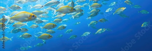 © Katherina, Naklejka premium Shoal of translucent blue fish swimming gracefully over a vibrant blue ocean background, ocean, shoal