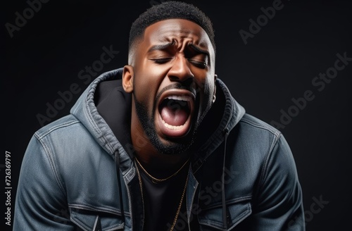 Fototapeta premium shock and emotional breakdown, depression. upset black man screaming, crying on dark background