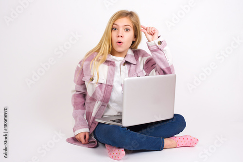 Naklejka premium Shocked caucasian teen girl sitting with laptop in lotus position on white...